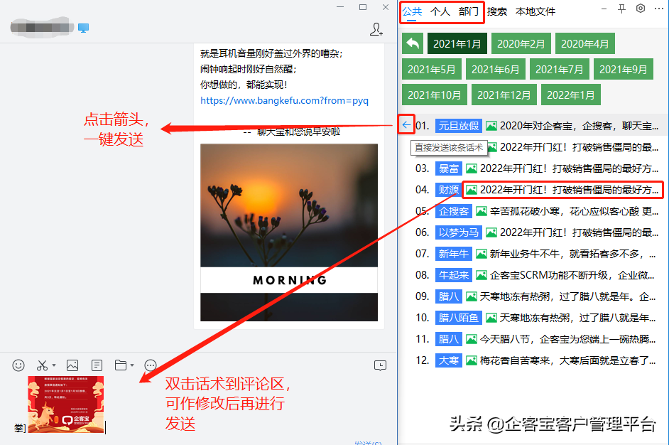 聊天宝采用“公共话术+部门话术+个人话术”的结构,企业可以将优质的话术回复放到公共话术中,实现企业团队多人共享,团队中所有客服都可看到并使用这一套优质话术,对话技巧统一高标准。在不同的对话情境下,客服可以快速检索相应的话术并发送给客户。
