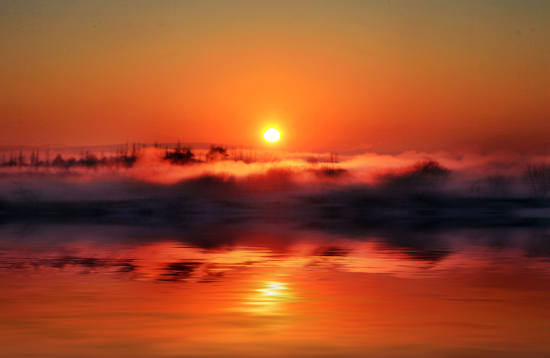 老景如斯也,亘鱼天、红绡万匹,日光穿射。