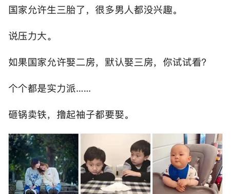 一位四十多岁的朋友告诉我,说男人不愿意生三胎但愿意砸锅卖铁娶三房的,肯定是女人,而且是三十岁以下的女人。四十岁以后的男人都明白,一夫一妻制是对男性的保护!