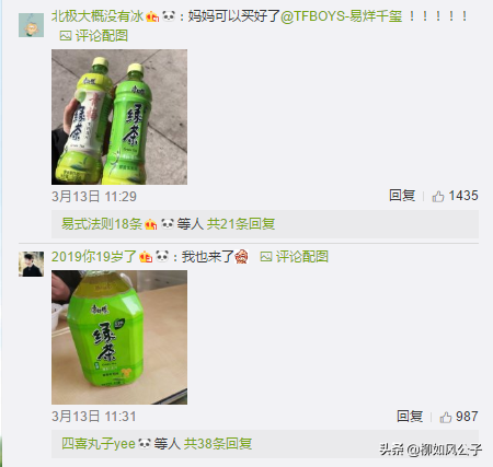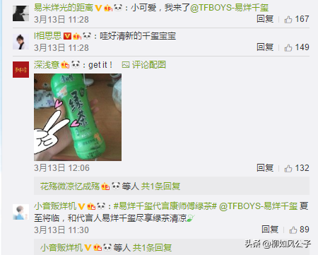 作为中国内地男歌手、舞者、演员,少年偶像组合TFBOYS成员的从易烊千玺,自从其代言康师傅绿茶后,短短的两三天时间中,康师傅官方**发布的易烊千玺代言绿茶**的评论量达到8.8万之多,其粉丝在评论区的评论也活了。