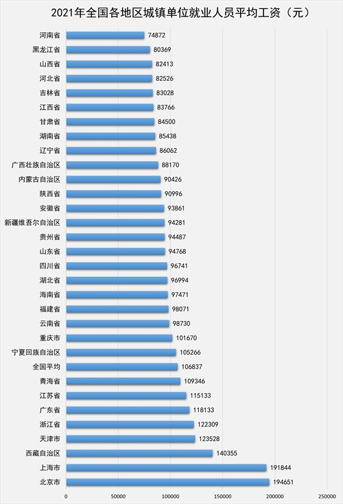 2021年,我国城镇单位就业人员平均工资达到106837元,首次突破10万元的关卡。分地区看,京沪两大直辖市是我国城镇就业人员平均工资最高的地区,都已经突破19万元大关。北京平均工资高达194651万元,位居全国第一;上海平均工资也达到191844万元,仅比北京略低。