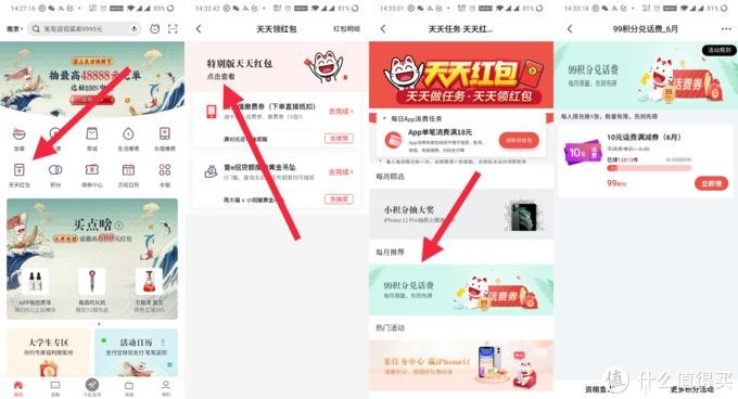 路径:首页“天天红包”,最上方“特别版天天红包”,点击查看,下拉每月推荐”99积分兑话费“