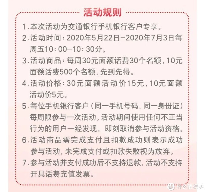 每个月的月末月初我都会为大家整理好合适的话费活动,现在活动大部分是以银行活动带头,电商的话费都很疲惫,没有什么拿得出手的折扣,我会继续关注话费活动,让各位值友永不停机!