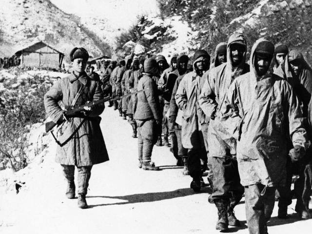 而该格洛斯特团的团长卡思,先是躺在尸体堆里装死,被后来的志愿军士兵发现后,只好从尸体堆里爬出来,自动摘下了缀有“荣誉”帽徽的军帽,垂着脑袋,走入俘虏行列。