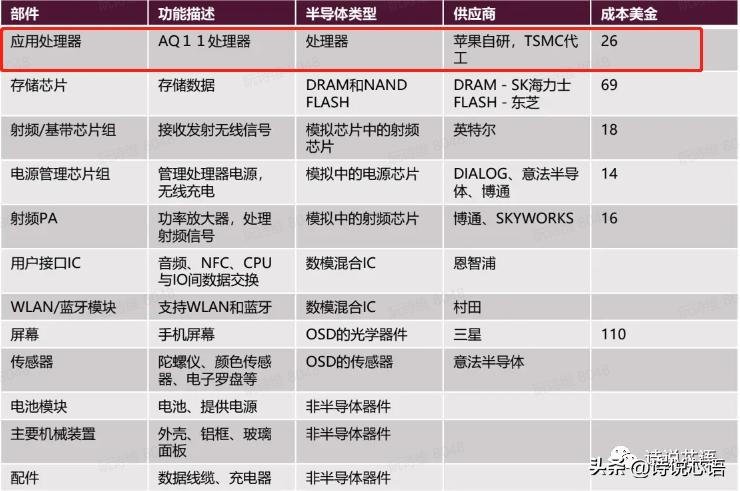 单从下面这张图片就能看出来,如果苹果手机的应用处理器如果使用高通的芯片,成本大概80美金,而自研的成本大概是26美金,每颗芯片能至少节省50美金,如果苹果每年卖2亿部手机,那么就能节省100亿美金,这个数据已经相当恐怖了,况且还有出货量巨大的MAC电脑。