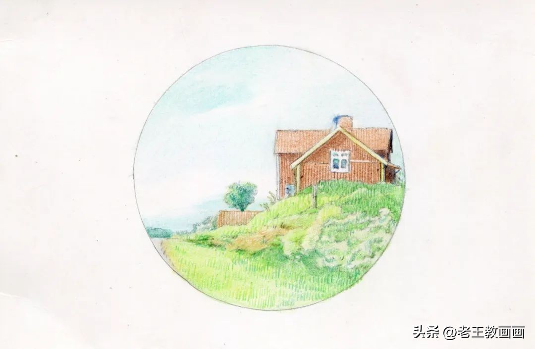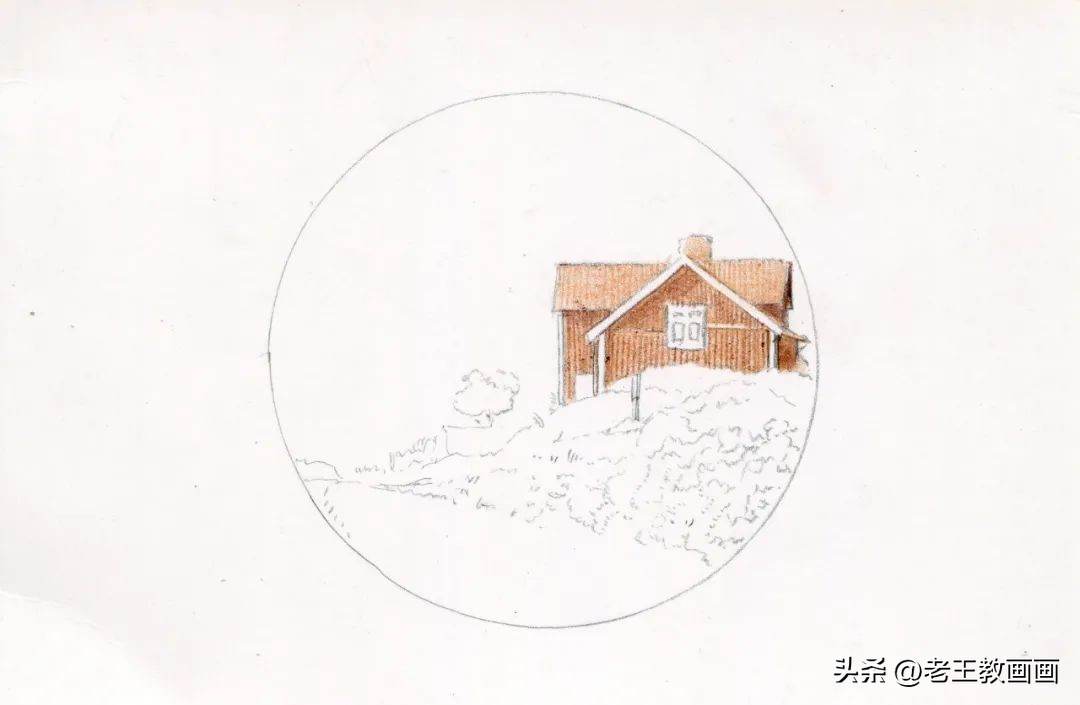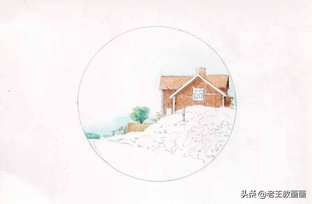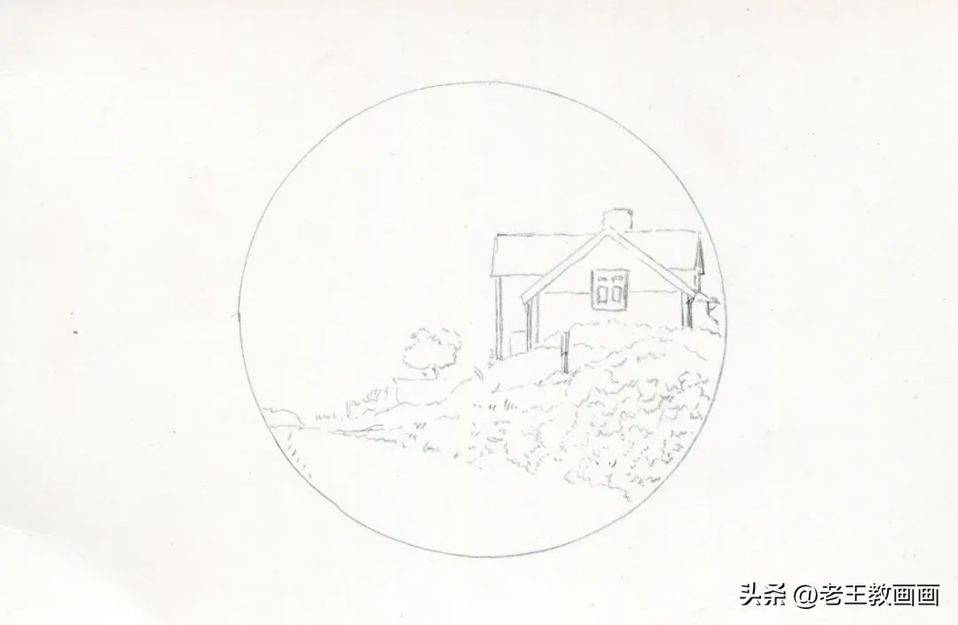 >>>【第1步】:先用圆规画个圆,根据原图,用2B铅笔房子和草地的形体区域,房子、草地和天空成两个半圆的比例(P1↓)