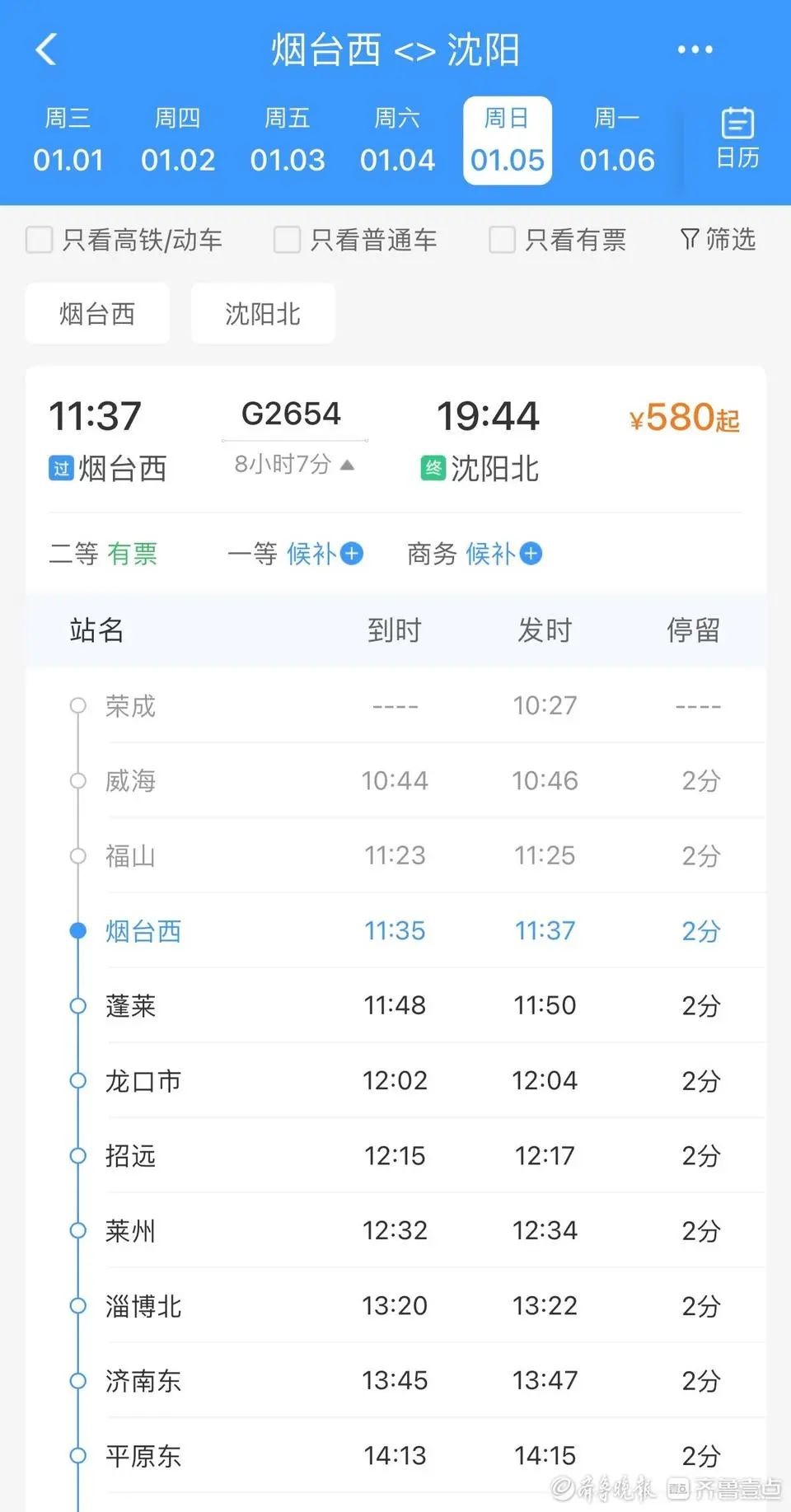 铁路12306上显示,2025年1月5日起,潍烟高铁增加烟台至北京的直达列车,G1084次列车7:22从烟台站始发,途经潍烟高铁沿线车站烟台西、蓬莱、龙口市、招远、莱州,以及潍坊北、邹平等车站,于12:42抵达北京南。