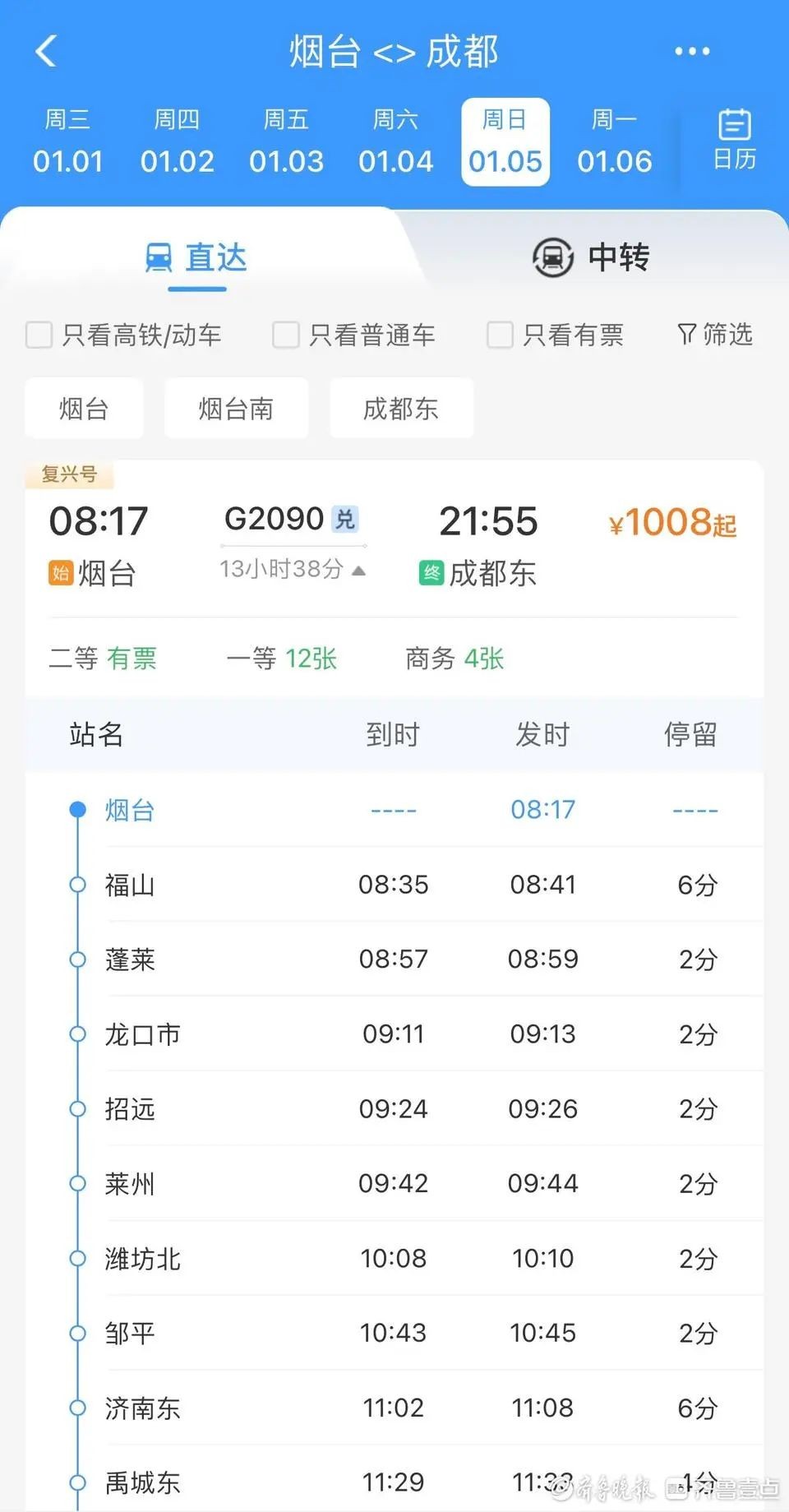 同时,2025年1月5日起,潍烟高铁也开通了从烟台至沈阳、成都等热门城市车次。其中,截至2024年12月23日12点,2025年1月5日G2090次列车龙口市-成都东二等座车票仅剩12张,莱州-成都东车票已售罄。