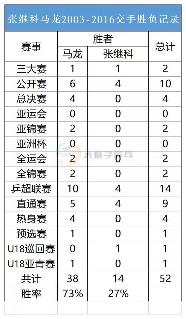 两人共交手52次,马龙38胜14负,胜率73%,最后一次交手2016里约奥运会马龙4-0张继科。