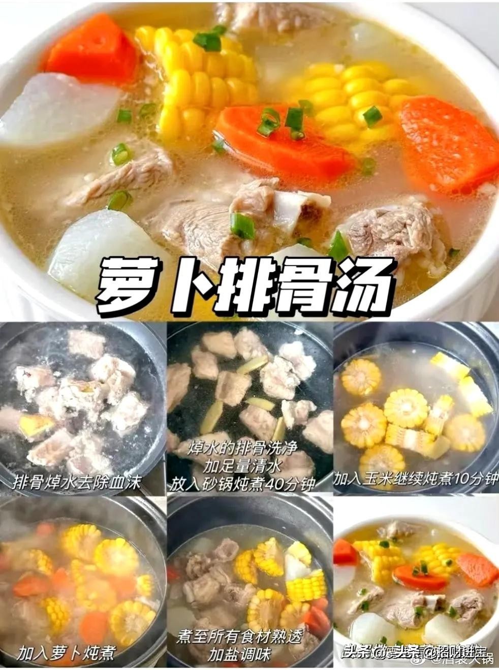 排骨炖玉米汤:将排骨和玉米一起炖煮,口感浓郁,营养丰富。