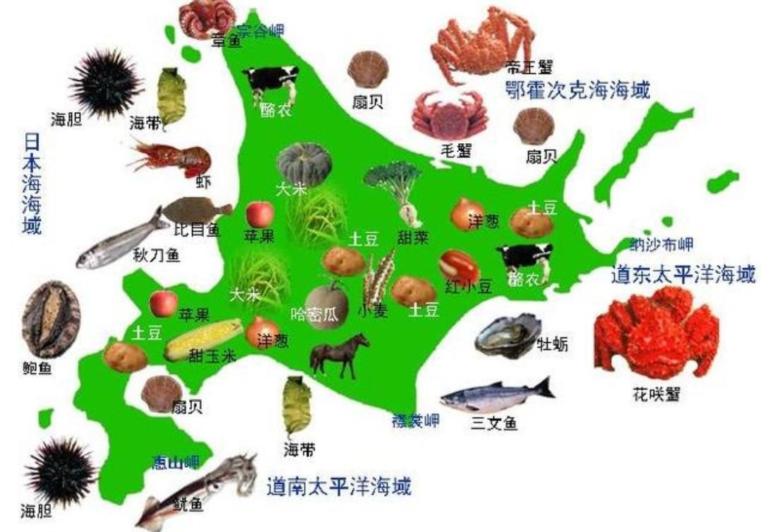 北海道岛位于日本北部,是日本第二大岛,面积约8.3万平方公里,是世界第21大岛屿。北海道岛周围海域是世界著名的四大渔场之一——北海道渔场【图3】,渔业资源极其丰富,渔业是北海道居民主要行业之一。著名的海产品【图4】有:帝王蟹、扇贝、秋刀鱼、三文鱼、鱿鱼、海胆、比目鱼等。