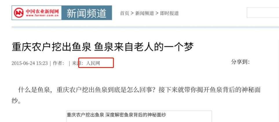 《重庆农户挖出鱼泉鱼泉来自老人的一个梦》,人民网2015年6月24日发布