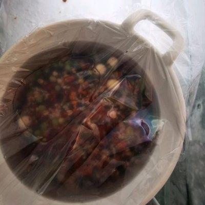 3、把水滤掉一部分,刚刚没过米面就可以,盖上保鲜膜放冰箱急冻层,冷冻30分钟以上