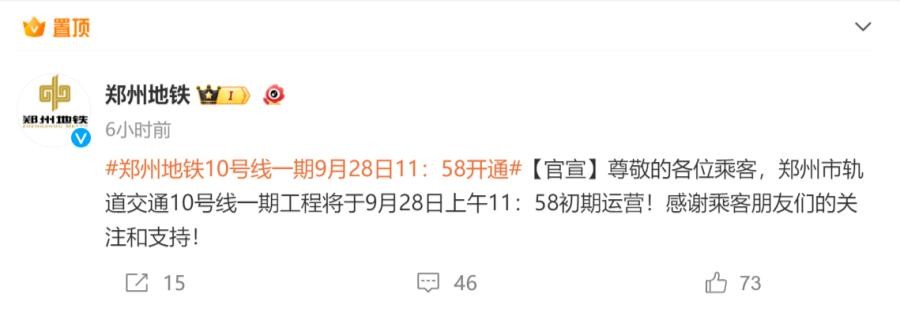 【官宣】尊敬的各位乘客,郑州市轨道交通10号线一期工程将于9月28日上午11:58初期运营!感谢乘客朋友们的关注和支持!