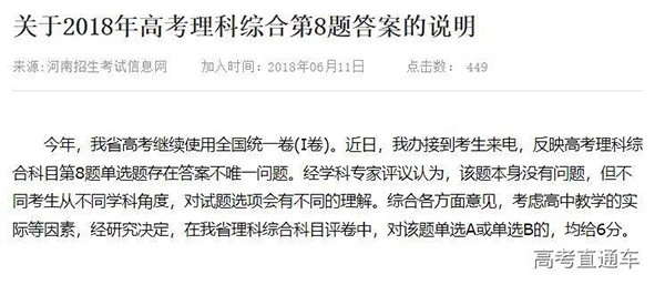 另外,河南招生考试信息网页发布消息:“今年,我省高考继续使用全国统一卷(I卷)。近日,我办接到考生来电,反映高考理科综合科目第8题单选题存在答案不唯一问题。经学科专家评议认为,该题本身没有问题,但不同考生从不同学科角度,对试题选项会有不同的理解。综合各方面意见,考虑高中教学的实际等因素,经研究决定,在我省理科综合科目评卷中,对该题单选A或单选B的,均给6分。”