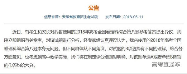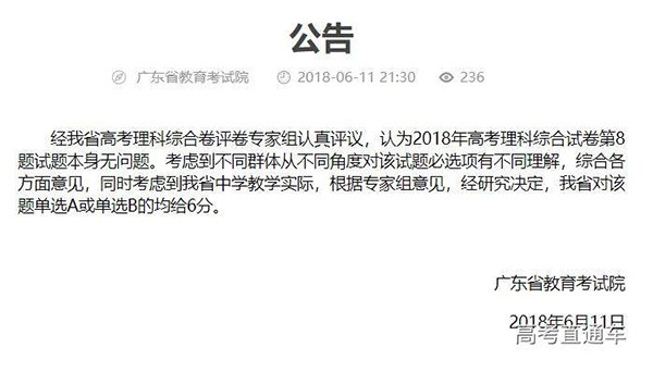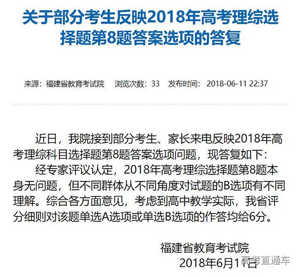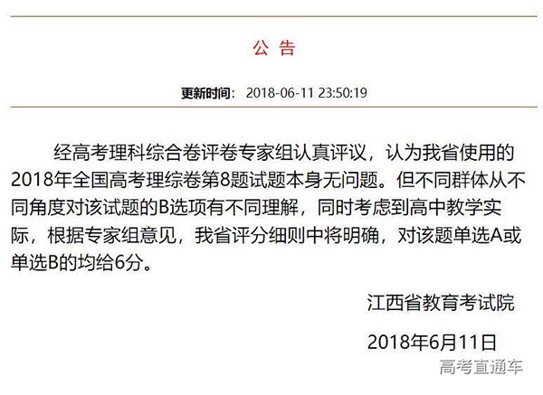 定了,经各省专家评议,2018年高考理科综合试卷第8题试题单选A或单选B的均给6分。下面是各省考试院发布的官方公告。已经发布公告的省份有广东、福建、河南、安徽、江西。