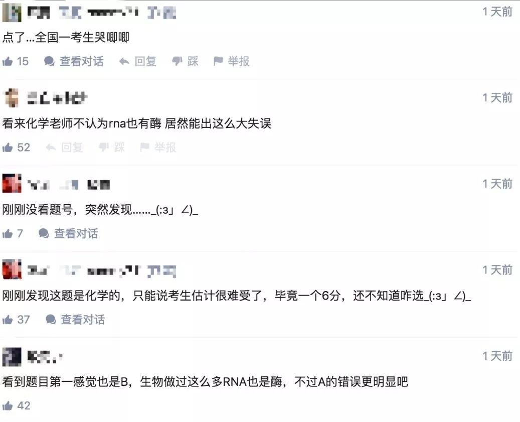 安徽高考采用的是全国Ⅰ卷,除了安徽以外,还有包括河南、湖北、福建、广东等9个省份采用这套试卷。截至今天下午4点,记者在微博上搜索发现,全国很多地方的考生和高中老师,都对理综第8题的答案,产生了较大争议,甚至有考生还拿出了高中生物课本里关于“酶”等相关内容的截图。
