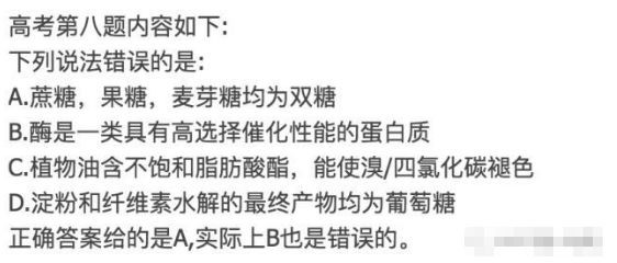 根据官方提供的参考答案,第8题的答案是A,也就是“蔗糖、果糖和麦芽糖均为双糖”,这一表述不正确。不过,在多名考生眼里,选项B“酶是一类具有高选择催化性能的蛋白质”,这一表述也有很大问题。