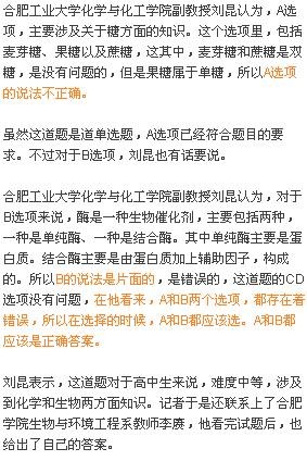 多名高三考生和家长争论的焦点,是今年安徽高考理科综合试卷的第8题,这是道单选题,分值6分。这道题的设问很简单:“下列说法错误的是”:要求考生从ABCD四个选项中,选择一个错误的说法。