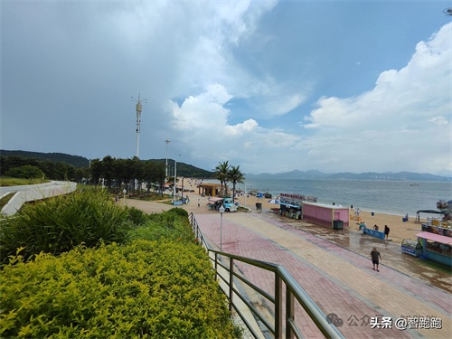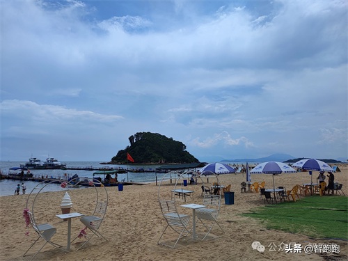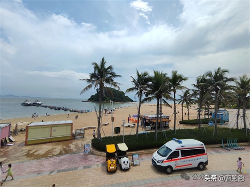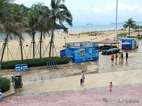 虎洲岛的左手边是黄金海岸旅游度假区,沙滩免费进入,但需要关注公众号登记一下即可,这边有海上乐园,有游泳区,有海上玩水项目;但是这里最近的住宿地方都离海滩几百米远,而且全程没有遮阴,真的是太晒了。