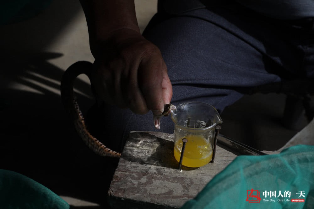 钱武松取蛇毒的动作已是十分娴熟。他徒手抓住蛇头,然后迅速将蛇的牙齿靠近一只小量杯的内壁,手的食、拇二指使劲,在蛇头两侧的毒腺部位挤压,只见一股黄色的液体便从牙齿中间喷射而出,“这就是蛇毒,有‘液体黄金’之称。”老钱不断地反复这个动作,斗大的汗珠已渗满额头。老钱每一次都不敢马虎,他说,取毒师最忌讳的就是喝酒,因为稍有大意,就可能会被蛇咬到。