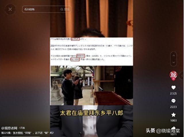 回国后不久,日本媒体爆出了在巴黎奥运会之前,他曾与队友石川佳纯一同前往东乡神社进行参拜的消息。
