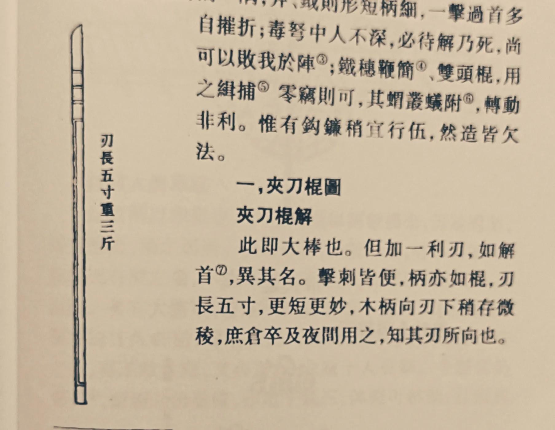 夹刀棍,刃长五寸,重三斤。