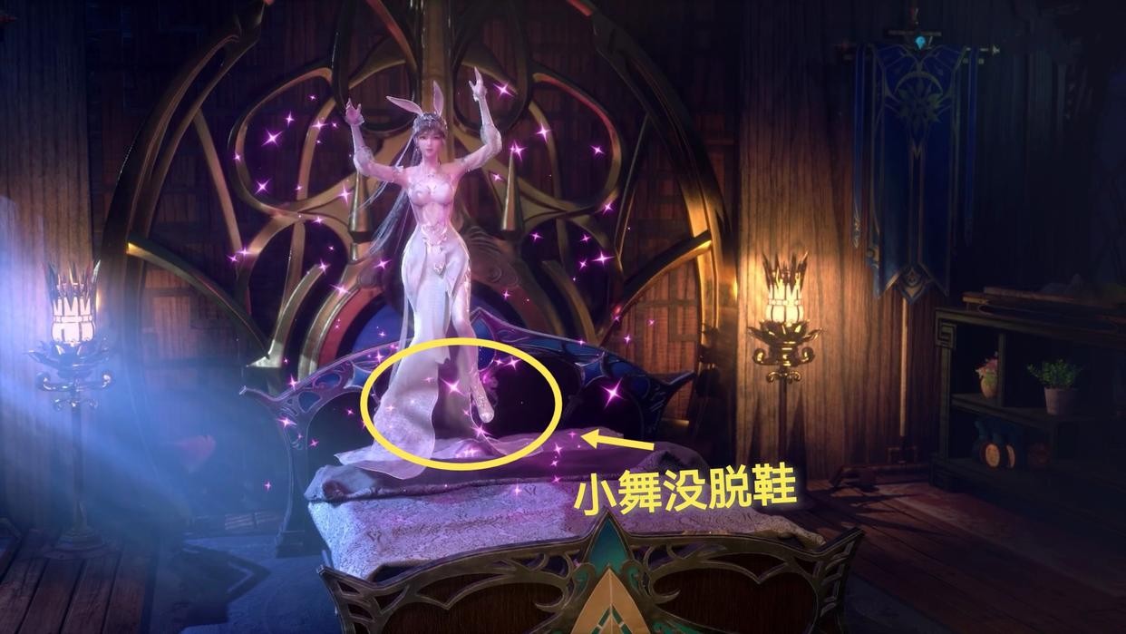 不过既然是在床上蹦跶, 为何不让小舞脱了鞋在床上蹦呢?相信不少粉丝更希望看到小舞不穿鞋的样子。而且高跟鞋踩到被子上却并没有让被子下陷,只能说剧尾是真的已经不在乎细节了。