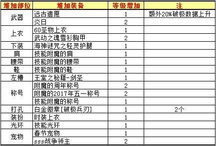 破极兵刃17级的Mr/秘技9件,与遗愿20级破极兵刃装备伤害差不多,所以平民建议堆20级破极,遗愿提升还是非常大的,建议弄一把,我的那把是有一个色子的游戏得的,下面给大家看看具体的装备