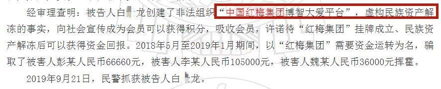 忽悠了成千上万人几年的“中国红梅集团 博智大爱平台”,虚构民族资产解冻的事实,白某龙被判刑了。