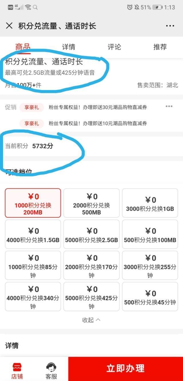 3.选择兑换积分或者流量,点击 “立即办理”。