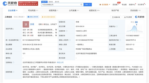 天眼查App显示,近日,今日头条有限公司发生工商变更,张利东卸任执行董事、经理,由涂晴接任。目前,张利东在该公司已无任职。今日头条有限公司成立于2016年8月,注册资本1亿人民币,经营范围含技术开发、计算机系统服务、数据处理、应用软件服务、从事互联网文化活动等,由抖音有限公司全资持股。