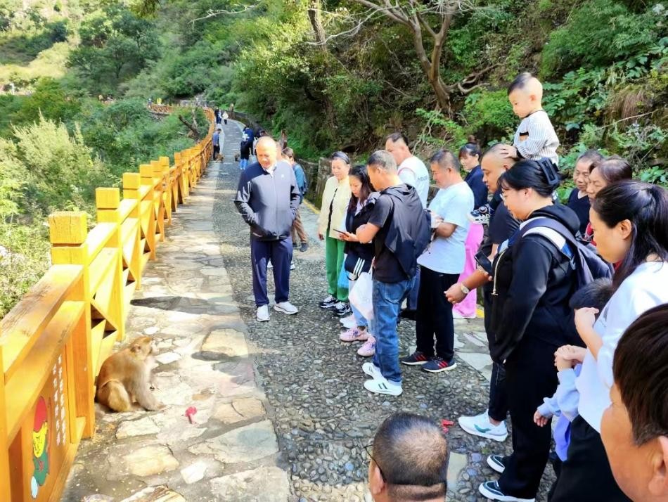 山西日报记者张琦报道 10月3日,在蟒河生态旅游区,游客寄情山水,尽情游玩。这里是蟒河的重要水源涵养地,也是猕猴生活的乐园。青山绿水之间,游客们与猕猴近距离互动,展示出一幅人与自然和谐共生的图景。