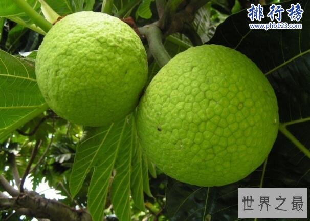 面包果树一般高三十多米,会开出雄花和雌花,结果的是雌花。最初雌花的形状像是一颗纽扣,最后长大成足球大小,里面塞满了像面包一样的果肉。一颗面包树一年大约有200颗果实,除了食用以外,面包果树还可做观赏树。