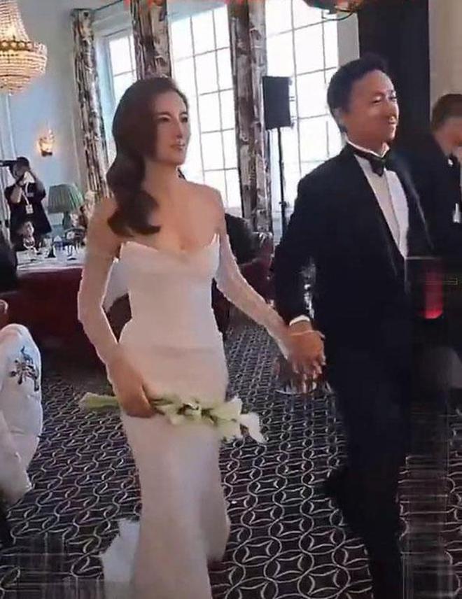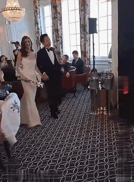 网友随后又曝出了另一段视频,视频中吴千语换了一套白色露肩礼裙,而施伯雄则换成了黑色西服,两人手牵手甜蜜走向舞台,一旁的爷爷施子清更是激动地给孙子、孙媳妇拍手送祝福。