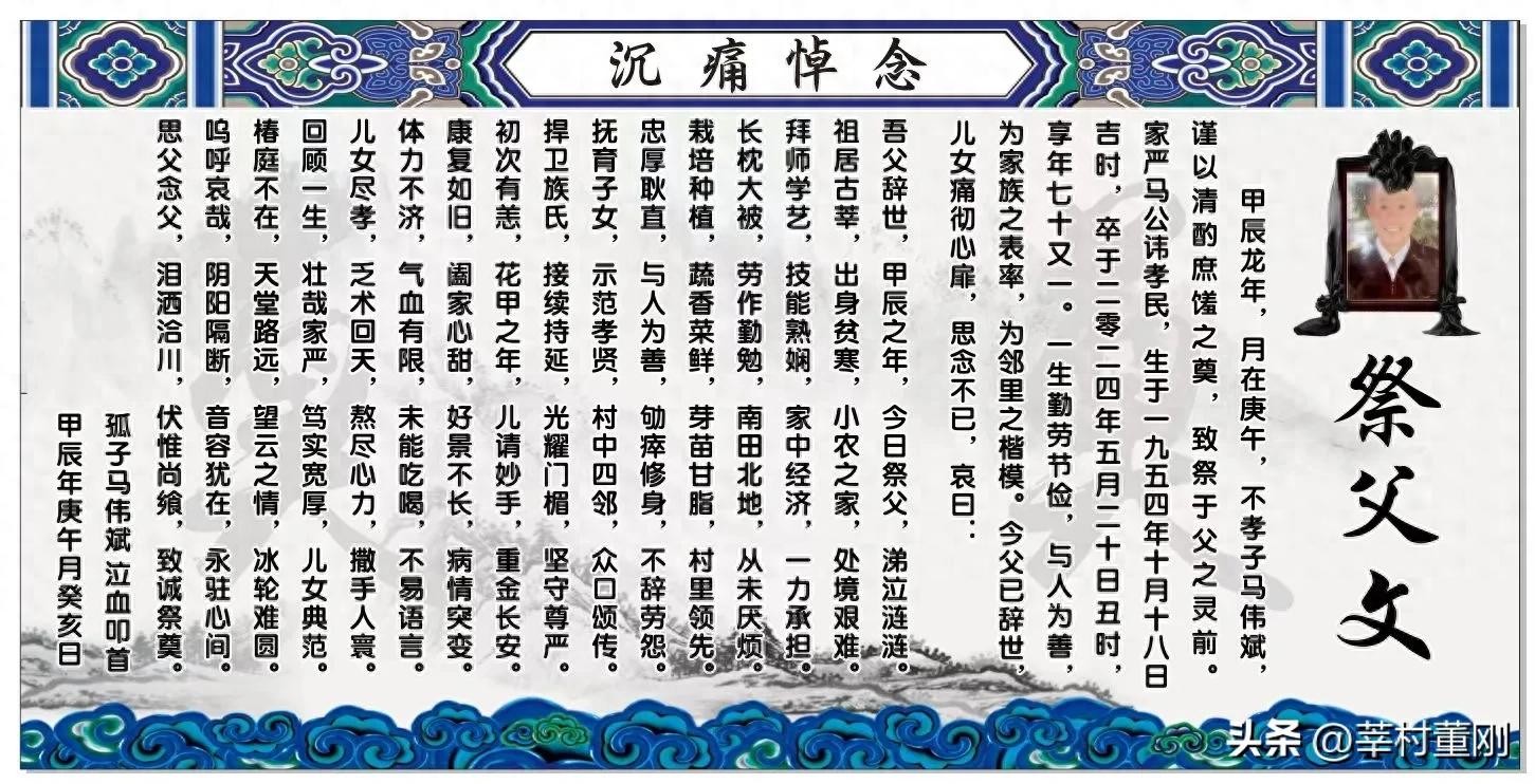甲辰龙年,月在庚午,不孝子马伟斌,谨以清酌庶馐之奠,致祭于父之灵前。家严马公讳孝民,生于一九五四年十月十八日吉时,卒于二零二四年五月二十日丑时,享年七十又一。一生勤劳节俭,与人为善,为家族之表率,为邻里之楷模。今父已辞世,儿女痛彻心扉,思念不已,哀曰: