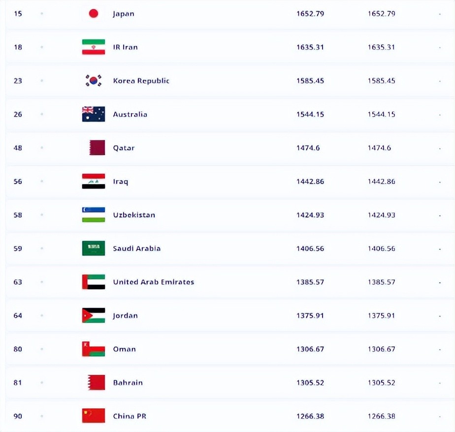 在FIFA官方公布的2024年终排名上,其中日本位列国际第15,高居亚足联第一,伊朗国际第18,排名亚足联第二、韩国国际在国际足联排名第23,是亚足联的第三名。随后的是澳大利亚 、卡塔尔、伊拉克 、乌兹别克斯坦、 沙特、阿联酋、 约旦 、阿曼、 巴林。中国排在第十三位,虽然排名不能完全说明实力,但是也基本反应了队伍的基本情况,国足以目前排名第13的位置冲击世界杯,确实需要克服很多困难。