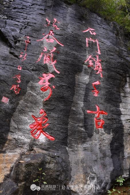 沿着的巴盐古道向上行走,就是石门洞和摩崖石刻。摩崖石刻“施南第一佳要”,行体竖书阳刻6个大字,清乾隆四十年(1775年),四川铜梁举人贾思谟赴宣恩知事时所题。所谓“施南第一佳要”,意为石门河不论是风景名胜,还是地理位置都位居施南第一。