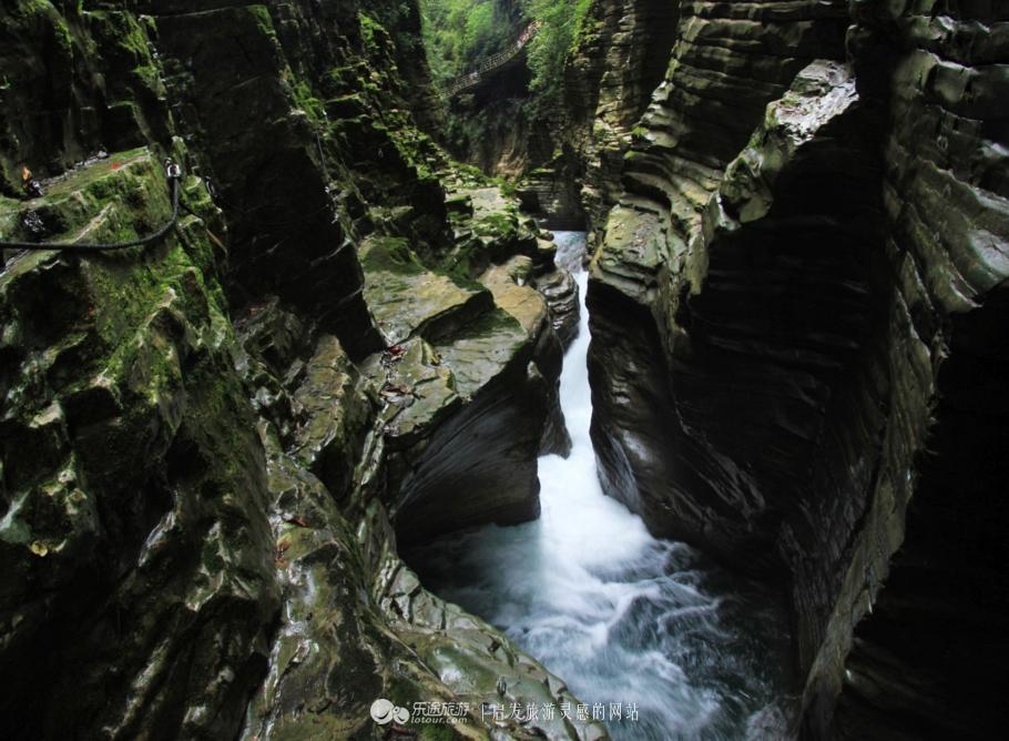 在峡谷里旅行,伸手可及石壁,石壁上的连绵青苔,碧绿柔软;栈道下的石门河水,浪花雪白;回水潭里的莹莹碧水,澄澈明净。90度的悬崖上,奇树倒挂,古藤悠悬,狂草飘逸。而仰望谷顶浓荫遮蔽下的蓝天,就如蓝星点点,令人心旷神怡。