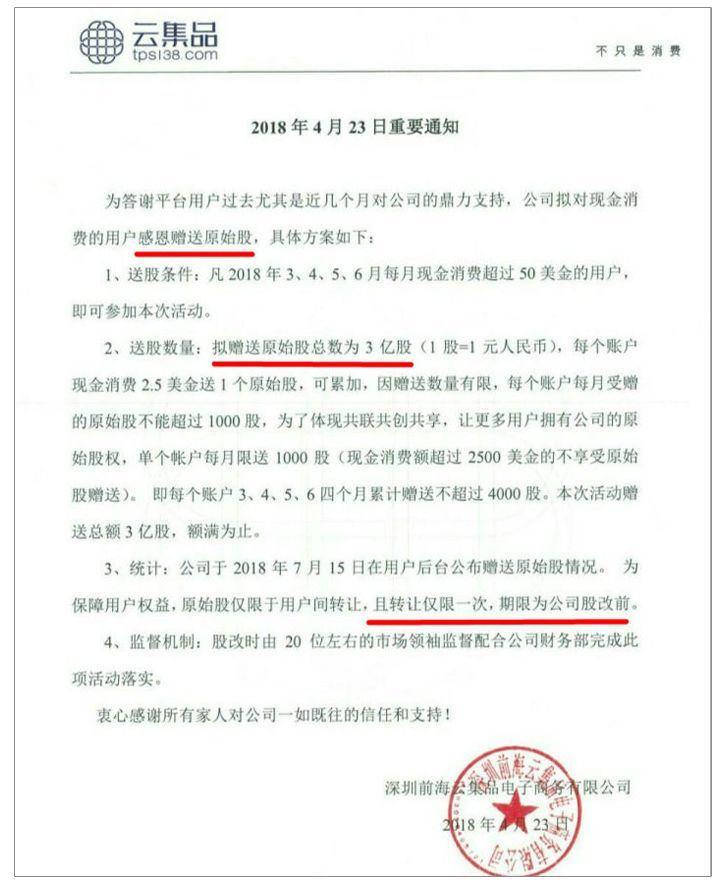 ▲云集品发出的赠送原始股的通知,图片来自网络。
