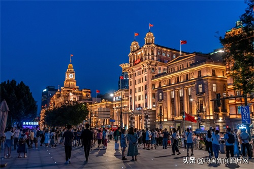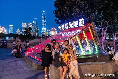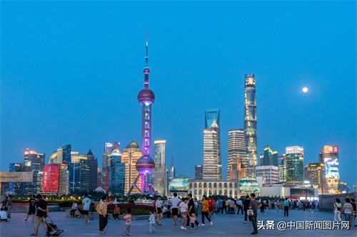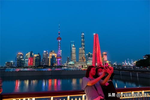 2021年6月23日晚,游客在上海外滩欣赏城市夜景。中新社发 王冈 摄