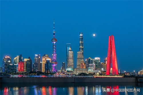 2021年6月23日晚,上海浦东陆家嘴摩天大楼和外滩人民英雄纪念碑亮起景观灯光。中新社发 王冈 摄