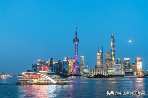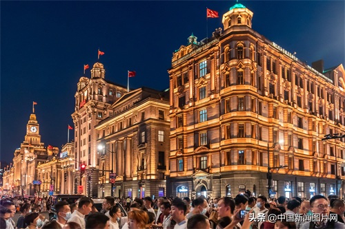 2021年6月23日晚,上海外滩沿线历史建筑和陆家嘴摩天大楼亮起景观灯光,游客观赏城市夜景。中新社发 王冈 摄