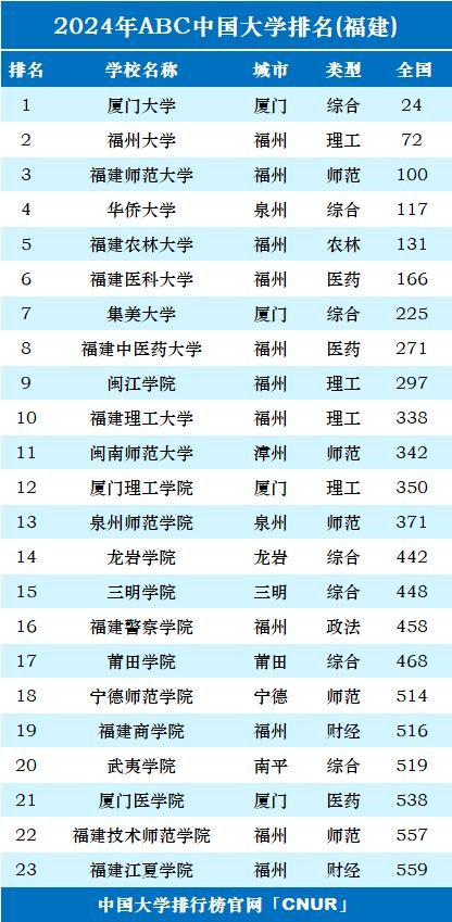 2024年ABC中国大学排名已正式发布,共有835所公办普通本科院校上榜,其中福建省23所。