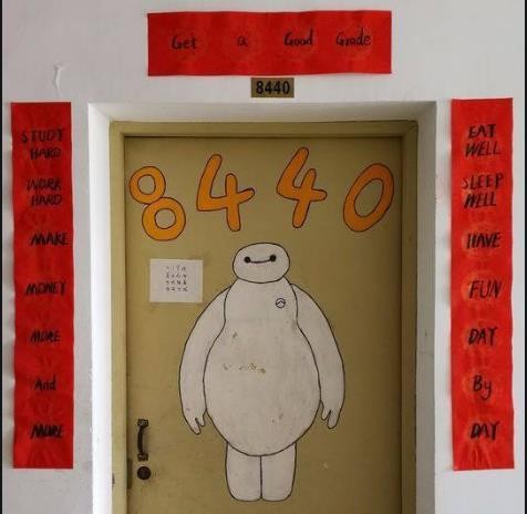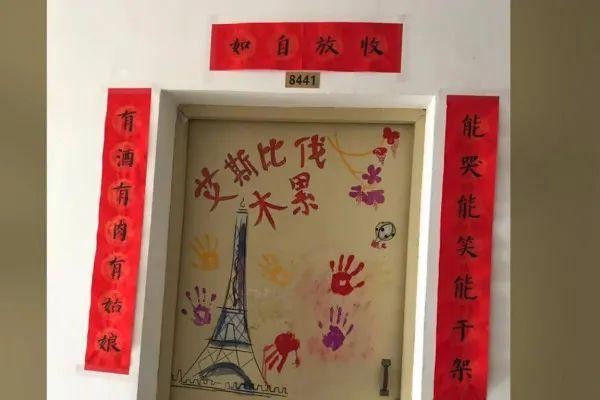 下面这个寝室就是一个典型的学霸寝室,不仅在大门上画了个可爱的大白,还用英文写下了整副对联。