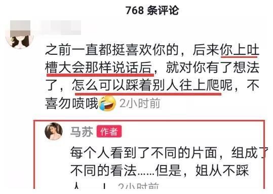 有网友吐槽马苏:你上吐槽大会那样说话,对你有想法了,怎么可以踩着别人往上爬呢?不喜勿喷。其实,网友在抱怨马苏脚踩昔日闺蜜李小璐,毕竟当初马苏在节目上说过:在娱乐圈一男一女真的可以只谈工作不谈感情,我要不是因为信了这个,我能被啪啪打脸。