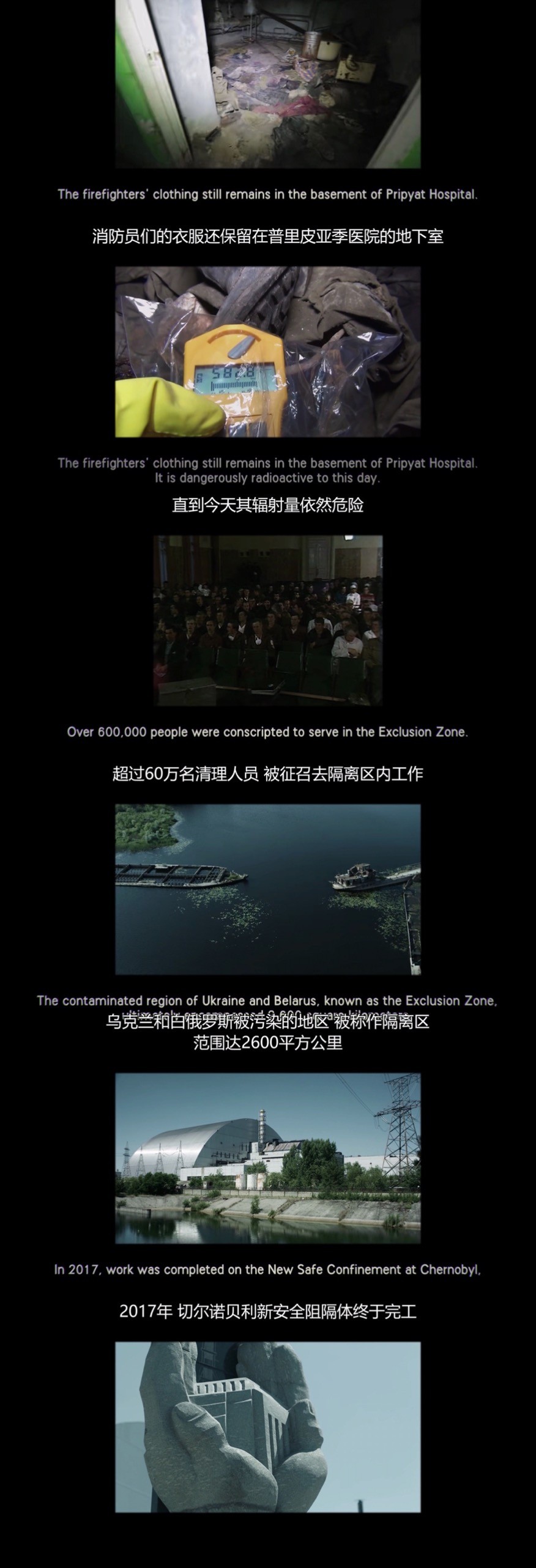 切尔诺贝利核事故带来了严重的人道主义、环境、社会和经济后果,至今仍影响着有关地区乃至全球。最后致敬事故发生后牺牲的战士们。