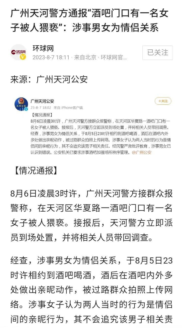 广州一酒吧门口,醉酒女子被“性侵”?警方通报来了