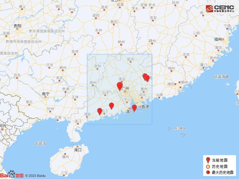 根据中国地震台网速报目录,震中周边200公里内近5年来发生3级以上地震共12次,最大地震是2023年3月8日在广东河源市东源县发生的4.5级地震(距离本次震中173公里),历史地震分布如图。