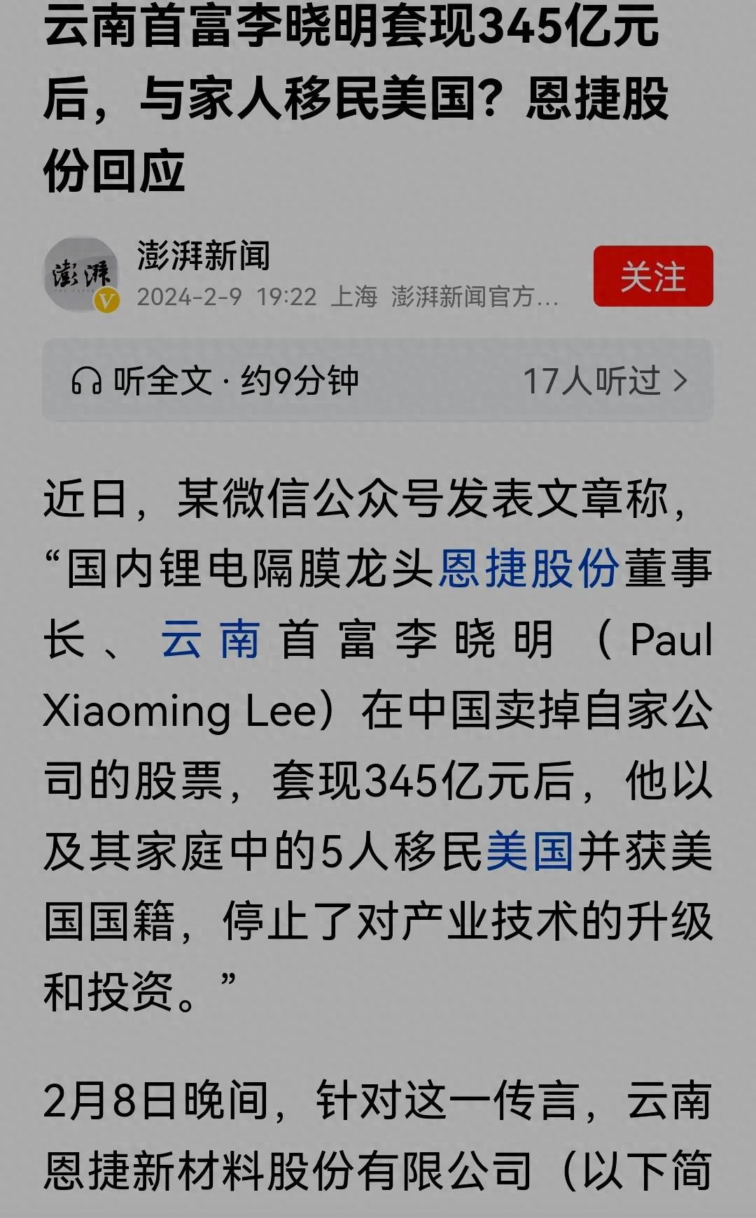2024年2月9日,澎湃新闻发表一篇文章《云南首富李晓明套现345亿元后,与家人移民美国?恩捷股份回应》,该篇文章主要针对近日某微信公众号“国内锂电隔膜龙头恩捷股份董事长、云南首富李晓明在中国卖掉自家公司的股票,套现345亿元后,他以及其家庭中的5人移民美国并获美国国籍,停止了对产业技术的升级和投资”的传闻,2024年2月8日晚上,“恩捷股份”做出了回应。